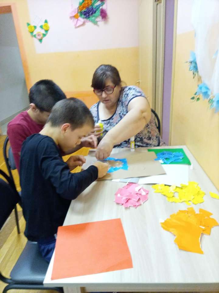 Рисование и аппликация играет важную роль в воспитании детей с ТМНР. Целью является развитие новых и сохранение остаточных функций организма. Большетроицкий центр развития и социализации продолжает начатую работу специалистами Центра культурного развития «Школа искусств». Совместная работа положительно влияет на социализацию детей и их общение. Воспитанники центра выполнят рисование, применяя способ примакивание губкой, а также сделают «рваную аппликацию».