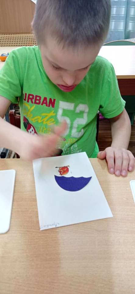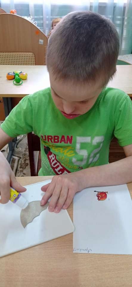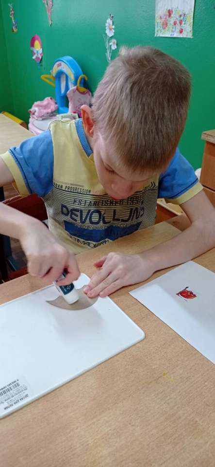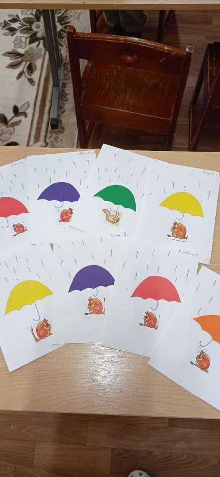 Занятие аппликацией учит детей пользоваться клеем – карандашом, намазывать им готовые формы (зонтики). На занятии в отделении Милосердия группа манеж была поставлена игровая задача: Спрятать белочку от дождика под зонтик.