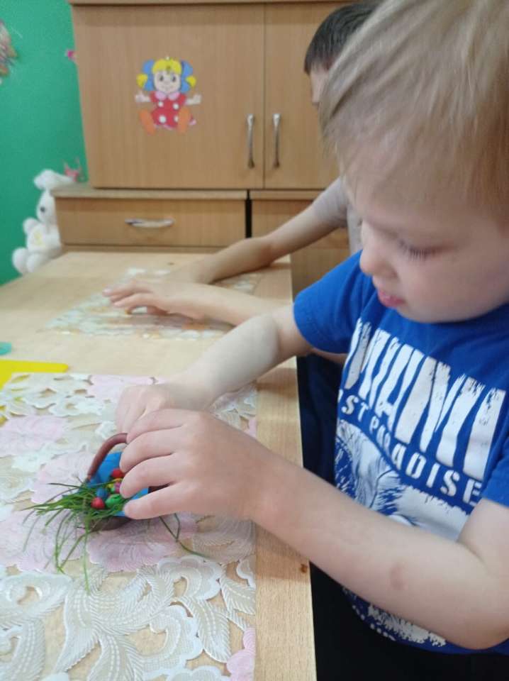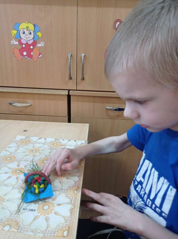 На занятии ребята лепили из пластелина разноцветные яйца, ведь на этот праздник они должны быть разноцветными.