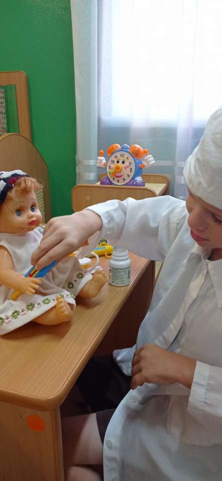 Игровые ситуации: " Померим кукле температуру", "Дышите не дышите", " Сделаем кукле и укол и дадим витамины". Воспитатели Наумова С. В. и Чмирева Ю. А.