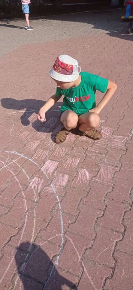 Дети играли в подвижные игры, рисовали цветными мелками на асфальте солнце, радугу, цветы. В завершении развлечения дети пели и танцевали под руководством Дрокина С. Н.