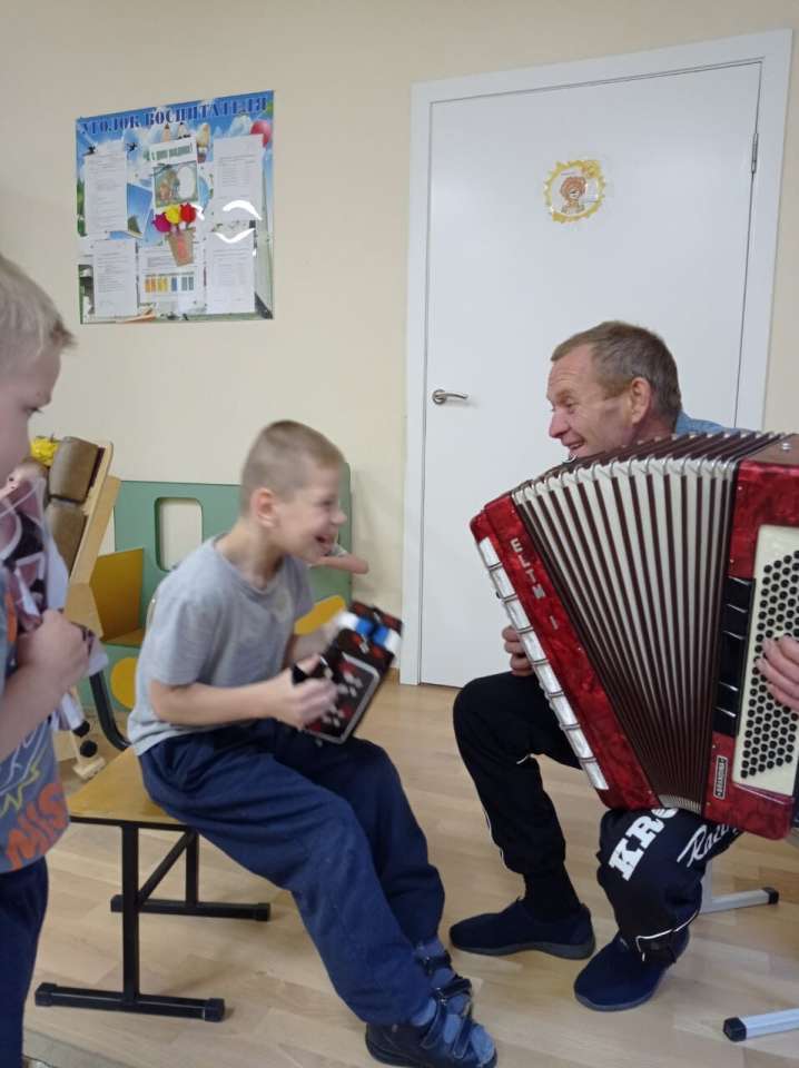 До чего же хороши на манеже малыши! С баянистом любим петь песни и частушки, и настраиваем дружно ушки на макушке. На гармошке Ромочка весело играет, а весёлый воспитатель песню запевает.