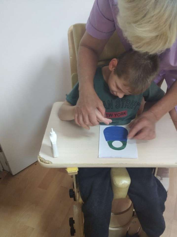 Цель - обучение выдавливать из тюбика клей на заготовку, прикладывать (приклеивать) её на лист бумаги, находить свою работу среди других, развивать мелкую моторику рук, творческие способности, зрительно - слуховое восприятие.