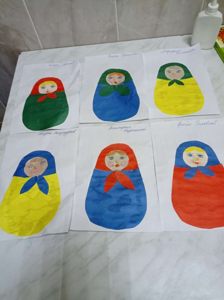 Дети познакомились с русским народным персонажем, сами выбирали цвет сарафанов и платочков. Учились выдавливать из тюбика клей на заготовку и прикладывать её на лист бумаги, придавливая (закрепляя) её; определять свою работу среди других, развивали мелкую моторику рук и зрительное восприятие, творческие способности.