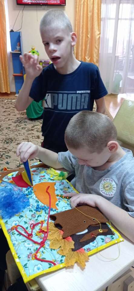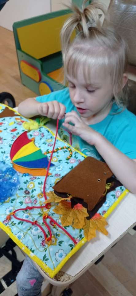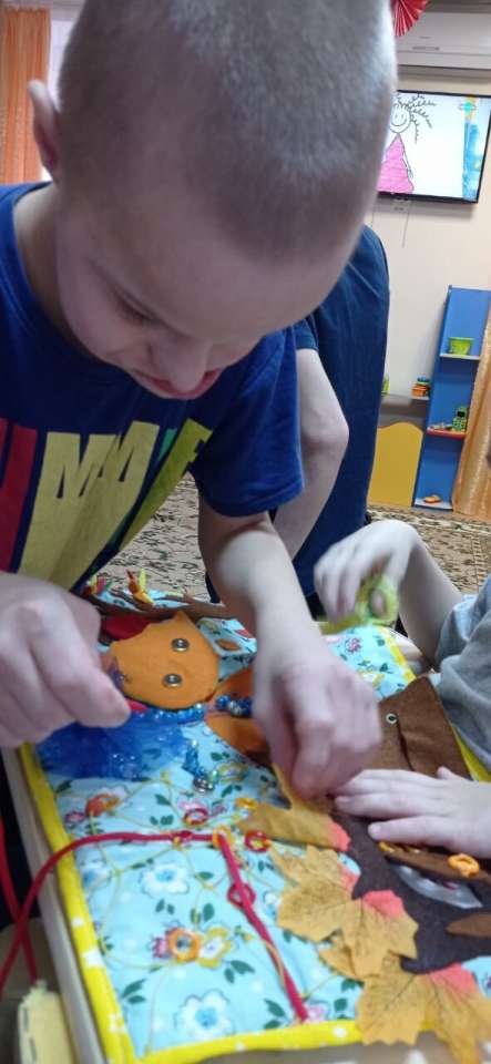 Дети рассматривали и тактильно обследовали тучку, ручку зонтика, ягоды рябины на дереве; выполняли упражнения по шнуровке паутины.