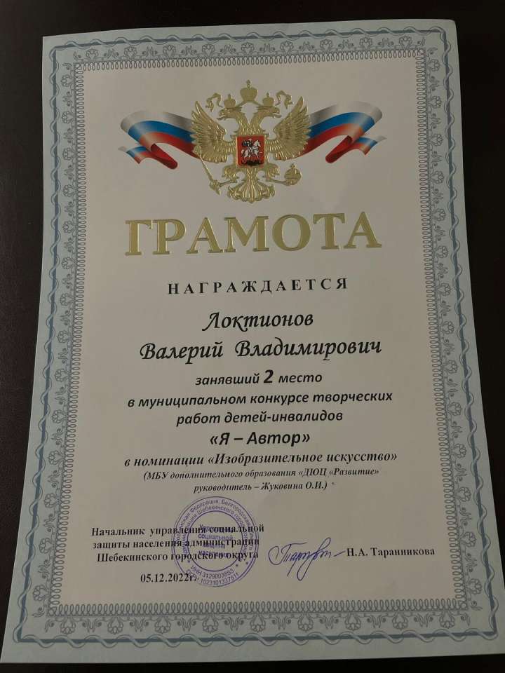 Сегодня Локтионову Валерию из группы мальчиков были вручены памятные подарки за участие в муниципальном конкурсе творческих работ детей-инвалидов "Я - автор" где занял 2 место. МБОУ дополнительного образования "ДЮЦ "Развитие" руководитель Жуковина О.И.