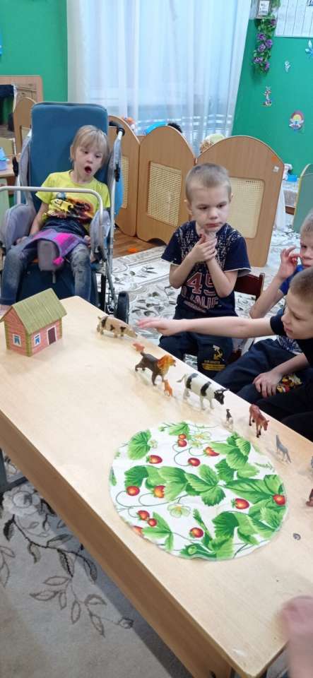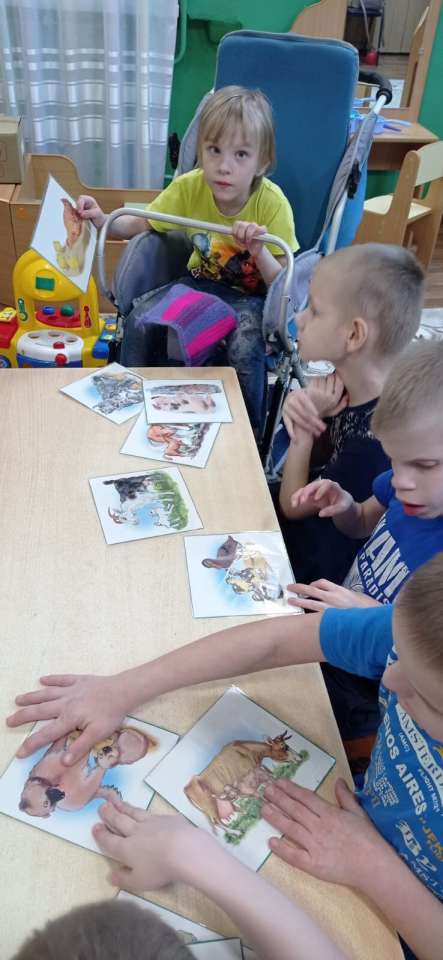 Воспитатель Наумова С.В. с ребятами группы манеж провела дидактическую игру "Потерялись". Воспитателем была создана игровая ситуация, в которой детёныши животных потерялись и мамы ищут своих детей. Дети помогли найти детёнышей, рассмотрели картинки, закрепили названия животных и их детёнышей. Она учила детей соотносить взрослое животное и его детёныша.