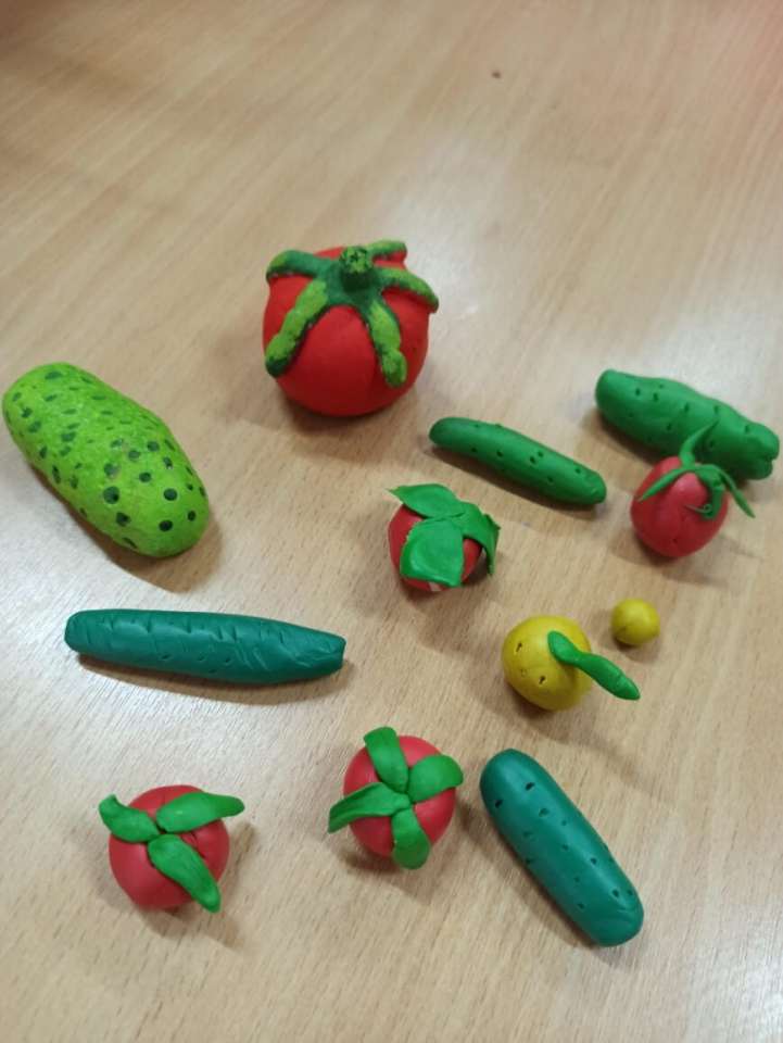 Цель: закрепить названия и характерные особенности овощей и фруктов, закреплять навыки работы с пластилином, развивать мелкую моторику рук, продолжать развивать способность чётко следовать устным инструкциям воспитателя.