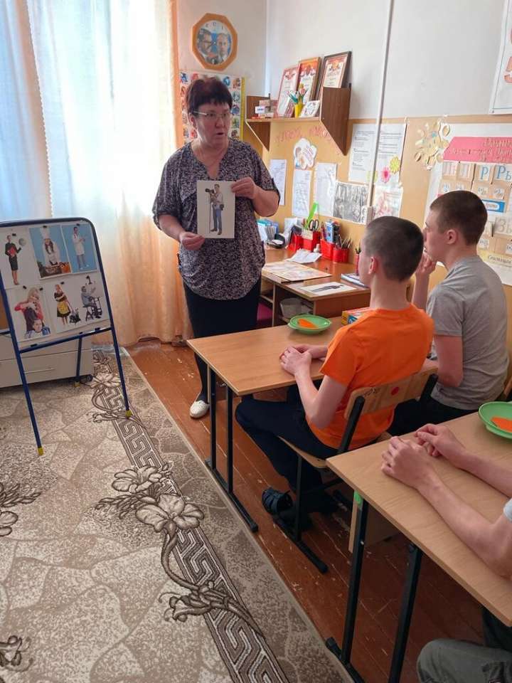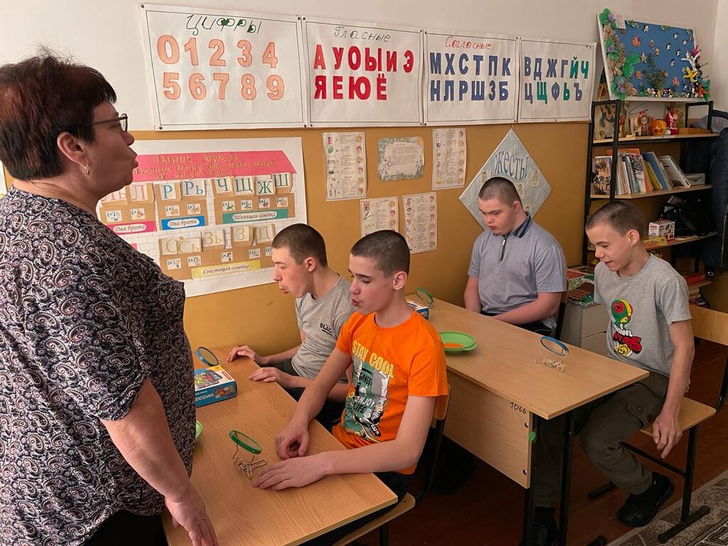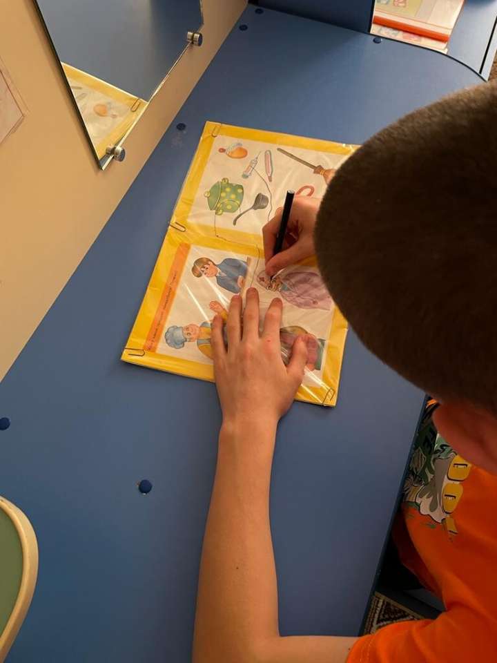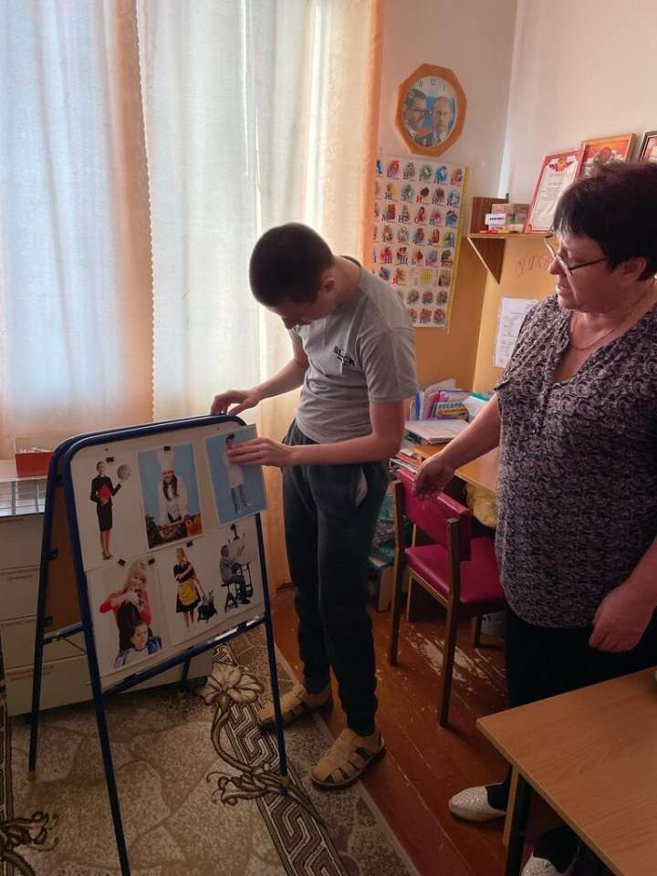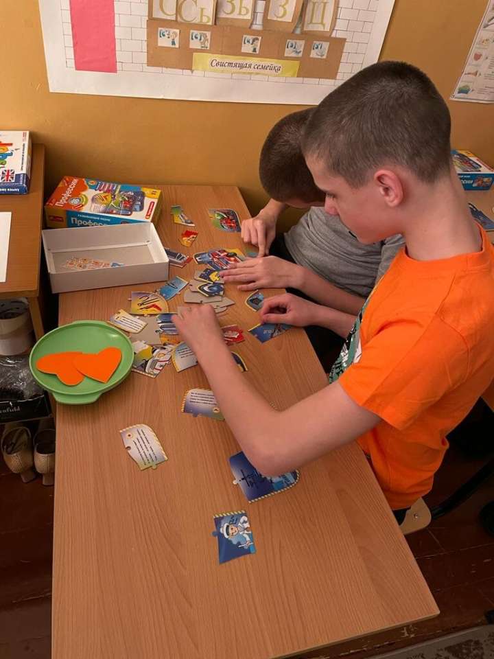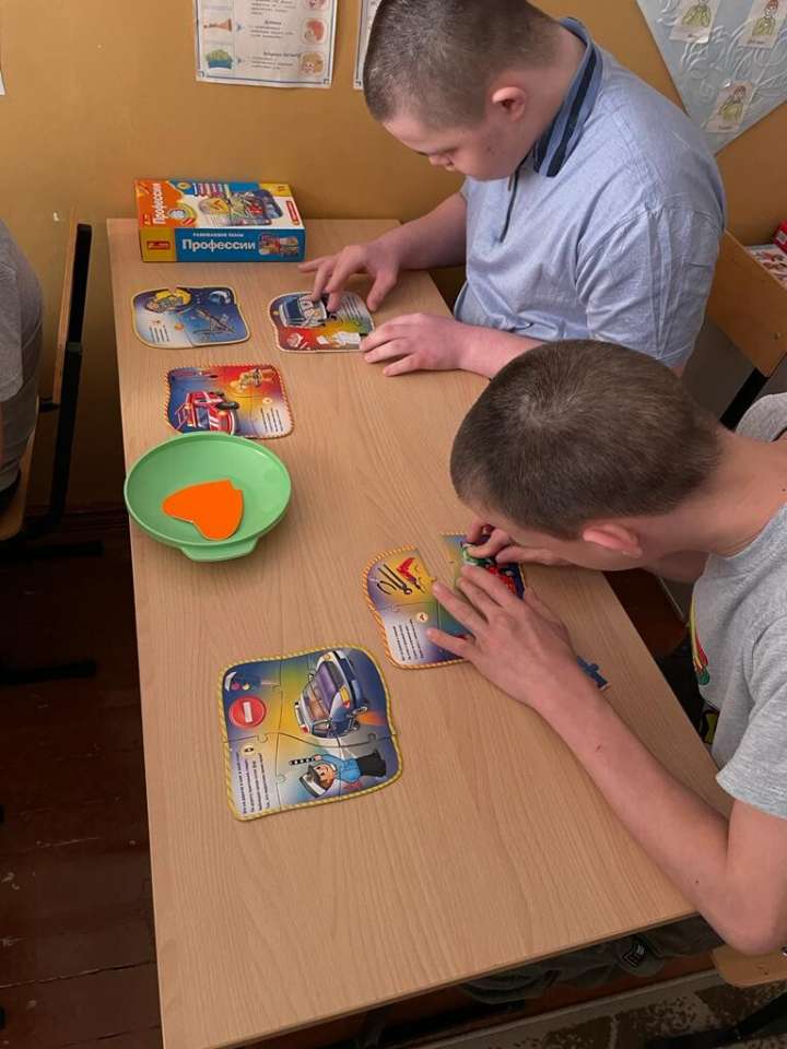 Наряду с развивающими занятиями в группе планомерно ведётся коррекционная работа с педагогом-логопедом. Прокопова А.Ф. познакомила ребят с профессиями взрослых людей, узнали какую работу они выполняют. Тем самым пополнился предметный и глагольный словарь, воспитанники учились составлять предложения и короткие рассказы с опорой на картинки. Развивались комбинаторные способности в игре «составь картинку», отрабатывались навыки словообразования в игре «большой, маленький». Ребята учились анализировать и распределять предметы по назначению в игре «соедини правильно». Закончилось занятие выбором воспитанниками понравившейся профессии с помощью сердечка.