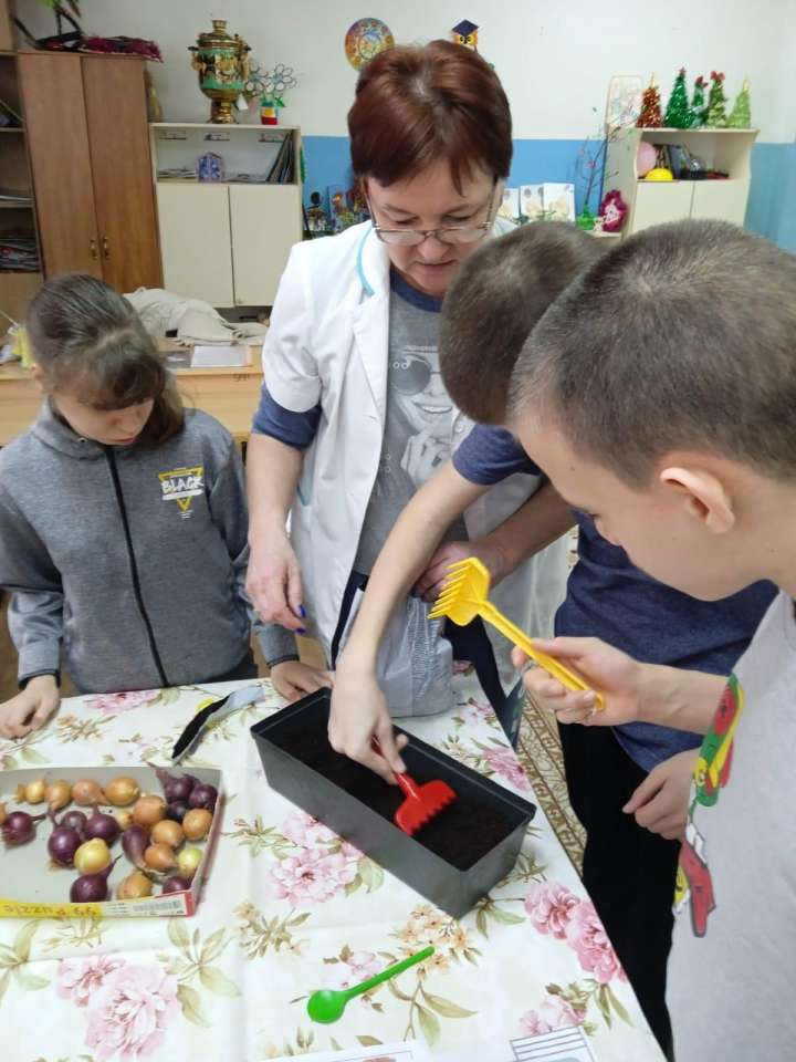 Прежде чем узнать тему проекта, ребята отгадали загадку: Сидит дед во сто шуб одет, кто его раздевает, тот слезы проливает". Все дружно ответили, что это ЛУК. Затем, после рассмотрения луковичек, определили форму и цвет, верх и низ, поиграли в игру " Съедобное- несъедобное ". На физкультминутке " Дружный лучок" импровизировали посадку лука в грядку и его рост. Вспомнили технику безопасности при работе с лопаткой и грабельками. Затем приступили к посадке лука.