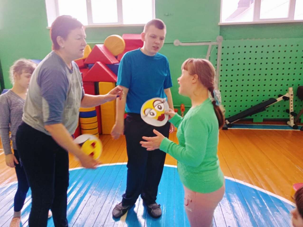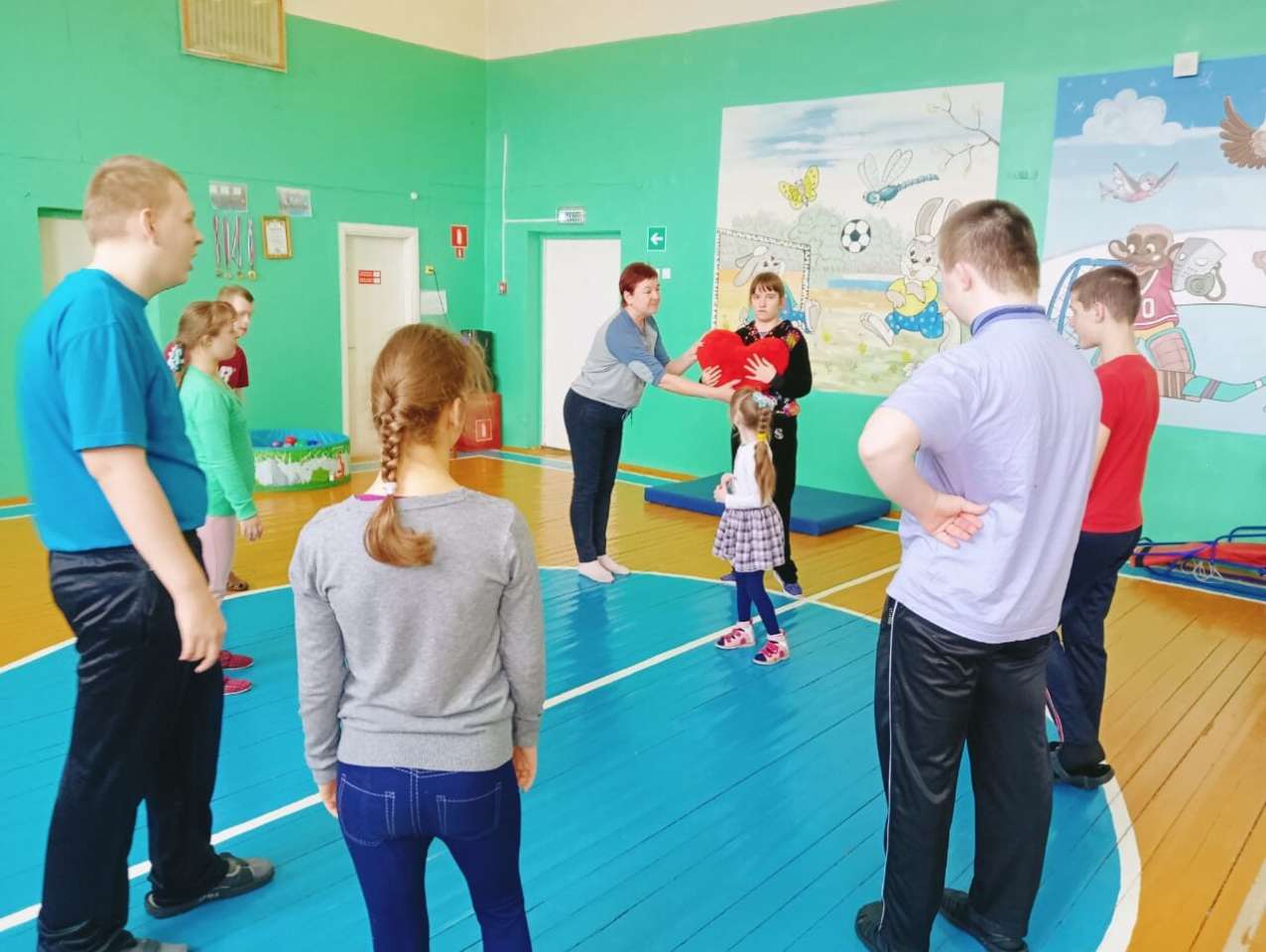 В спортивном зале дети дарили друг другу воздушные поцелуи, играли в весёлые игры: " Позови ласково ", " Пирамида любви", "Карабас Барабас".