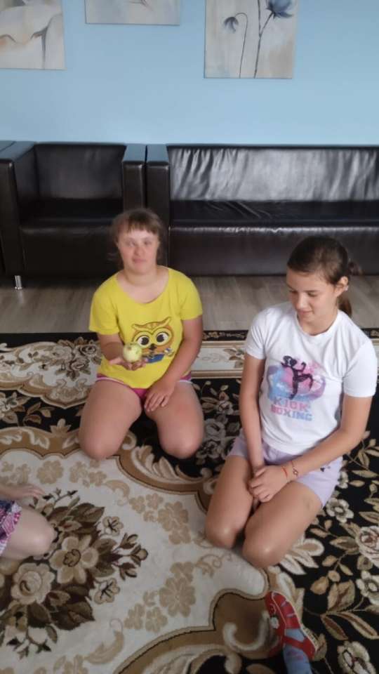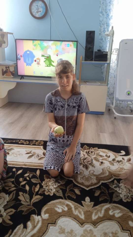 На прогулке ребята повторили, яблоки бывают большие и маленькие, круглые, сочные. После прогулки девочки поиграли в игру: "Передай яблочко и назови своё имя"