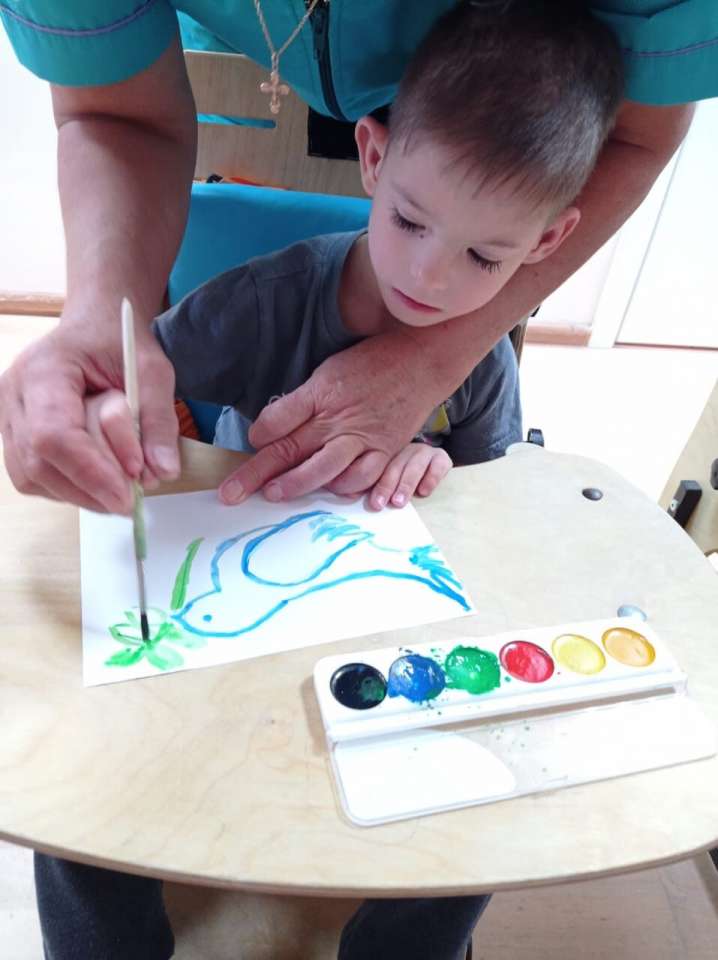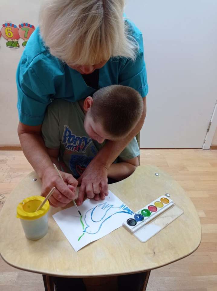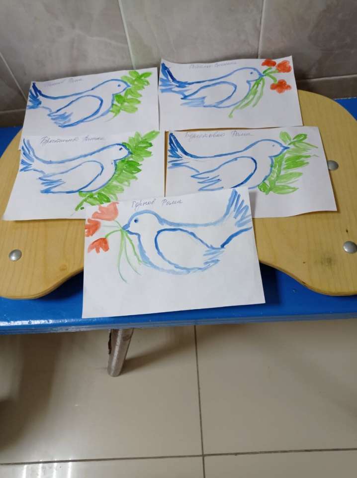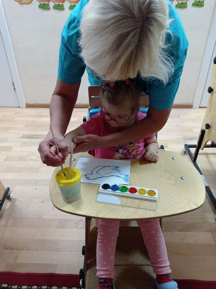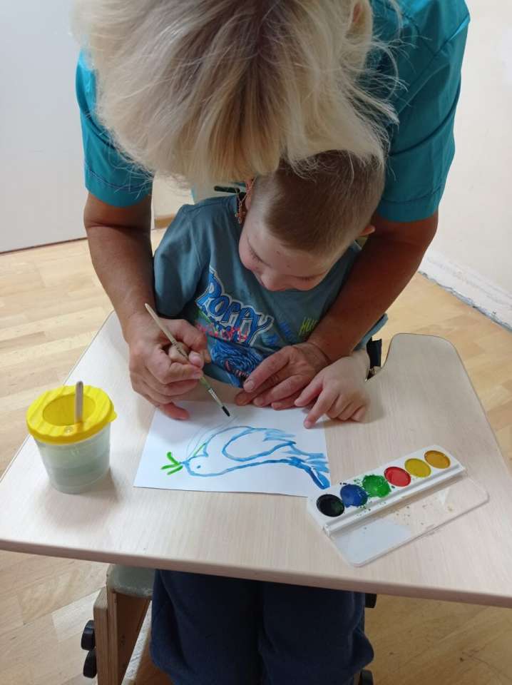 Дети обводят контур рисунка кисточкой, разукрашивают рисунок называя и закрепляя цвет. Выполнить рисование кистью с помощью воспитателя, учить правильно держать кисть манипулируя ею. Коррекция мелкой моторики рук, усидчивости, внимания, мотивации. С помощью имитационной игры показать как летят голуби. Воспитатнль Ватулина С. В.