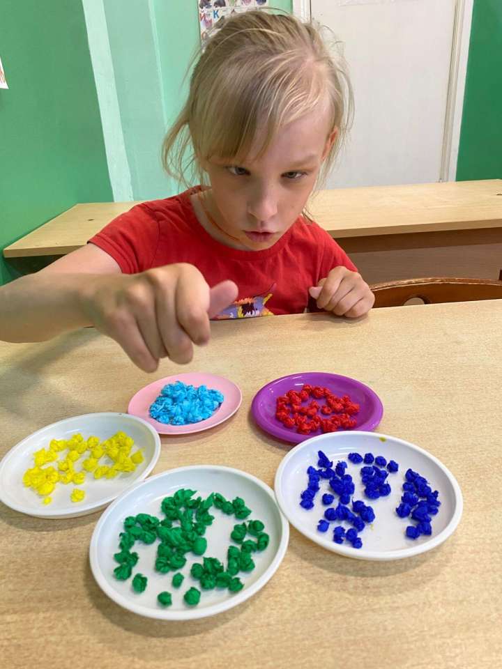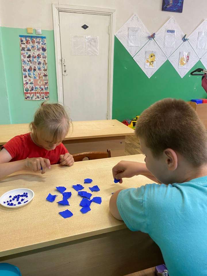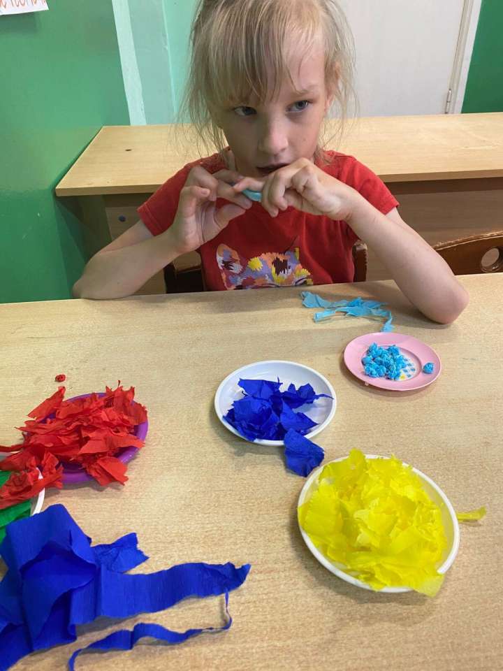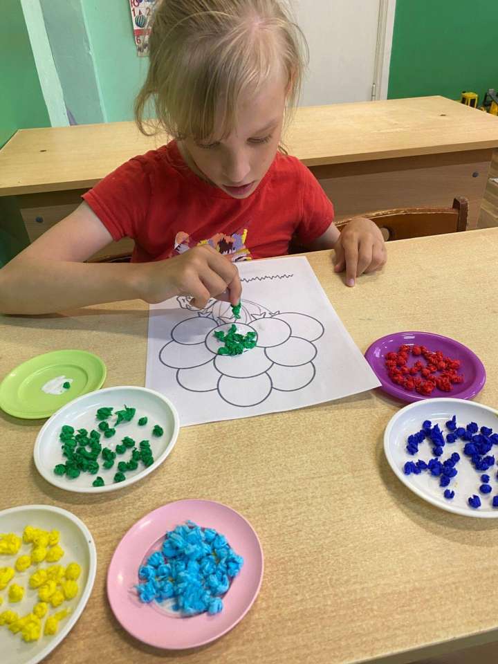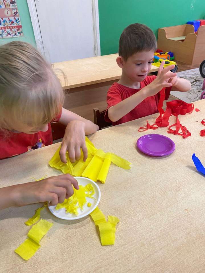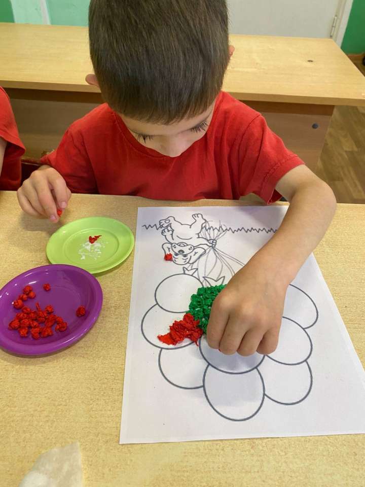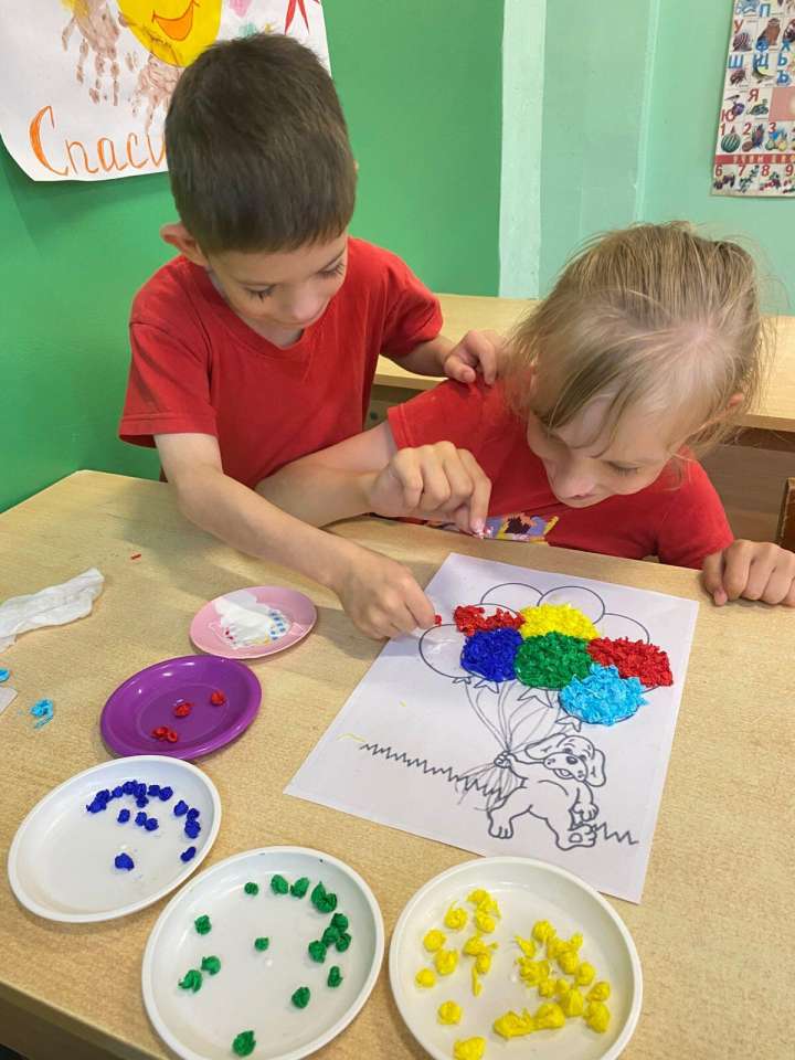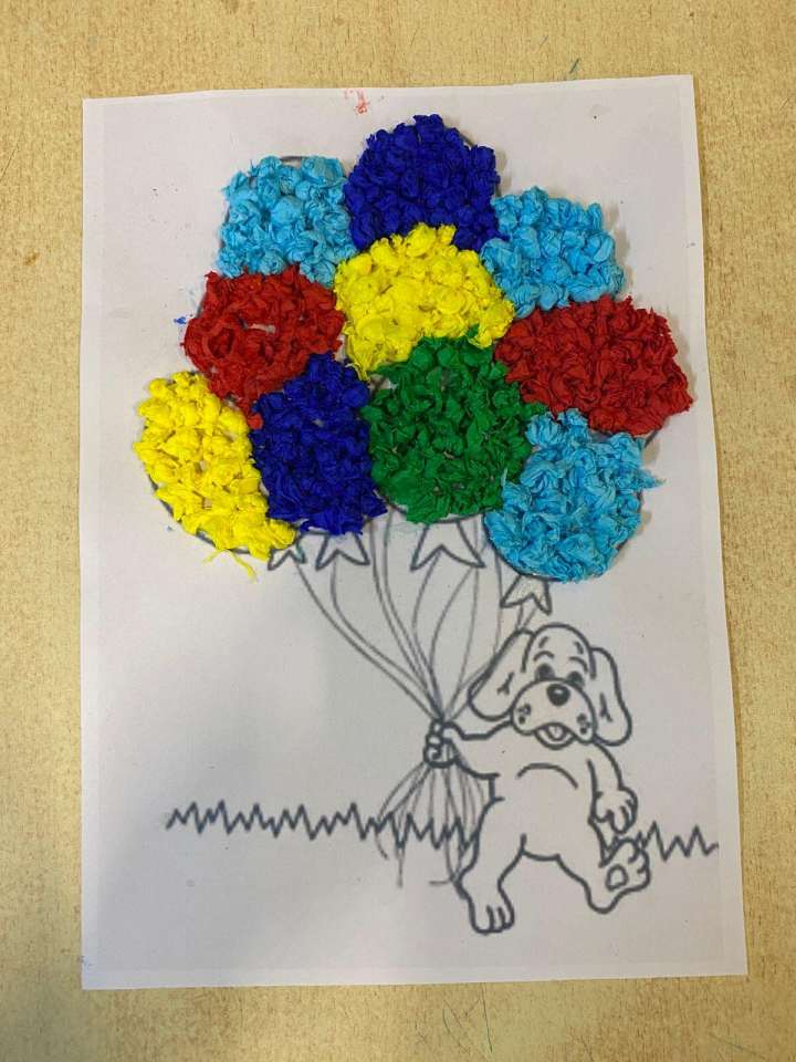 Дети совместно с воспитателе Наумовой С.В. учились делать разноцветные шарики интересным способом. Отрывали кусочки гофрированной бумаги, окатывали из них шарики, макали в клей и приклеивали на рисунок.