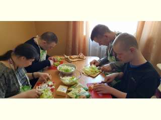 Воспитанники отделения Молодой инвалид продолжают осваивать азы поварского искусства. Под руководством социального педагога Сиденко О.С. ребята готовили салат "Цезарь" и вкусный десерт.