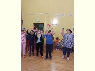 Ребята с удовольствием под музыку повторяли за воспитателями танцевальные движения и искали кегли, которые соответствовали цвету шариков в их руках. Занятие провели Дрокина И.В., Салбанова З.С. и Бутова А.А.