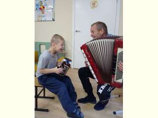 До чего же хороши на манеже малыши! С баянистом любим петь песни и частушки, и настраиваем дружно ушки на макушке. На гармошке Ромочка весело играет, а весёлый воспитатель песню запевает.