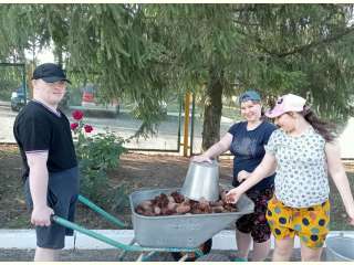 Группа молодой инвалид под руководством инструктора по труду Арзумановой Г.И. на занятие по трудотерапии. Уборка на территории